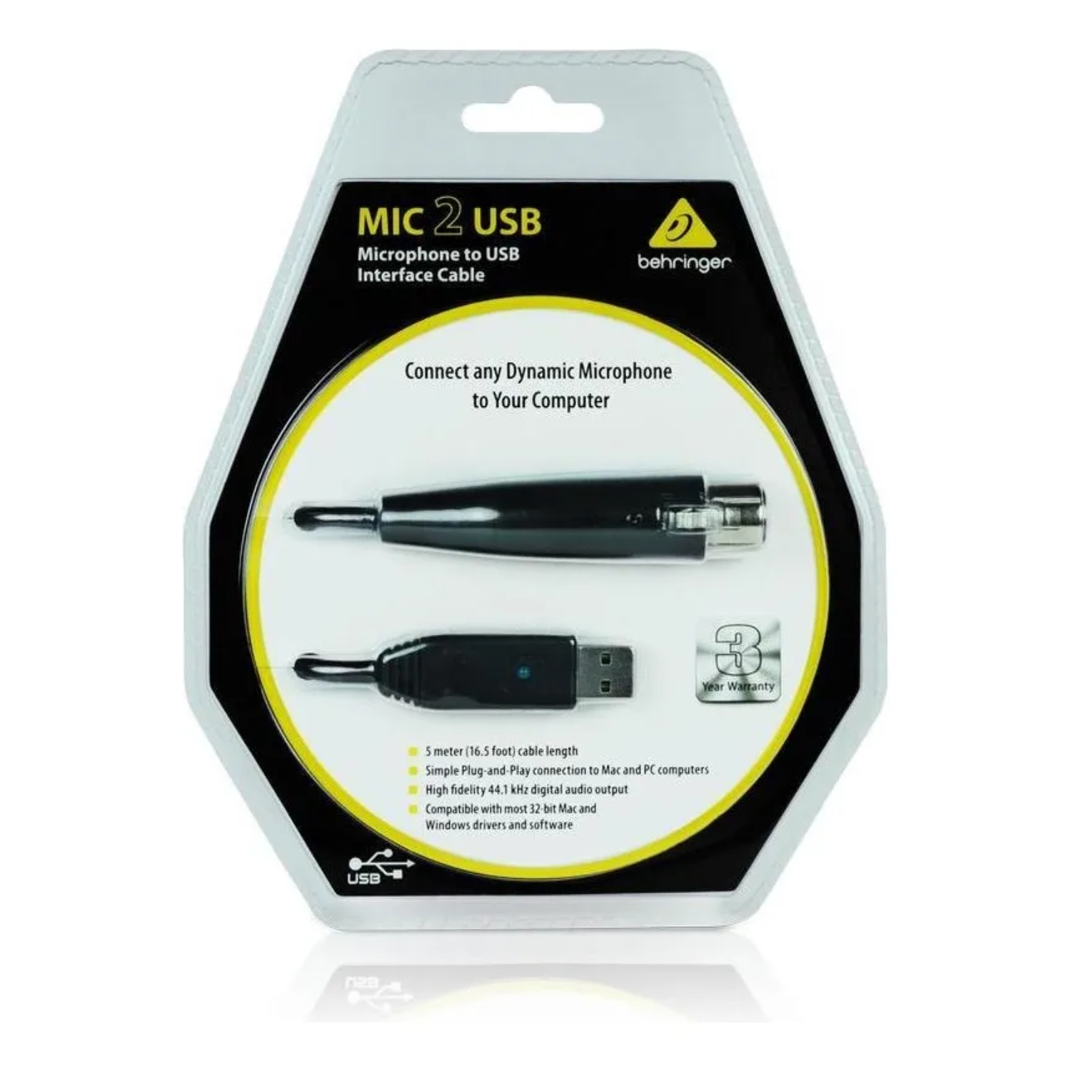 O Mic 2 USB da Behringer é um cabo com 5m de extensão, com conector USB de um lado e XLR do outro.