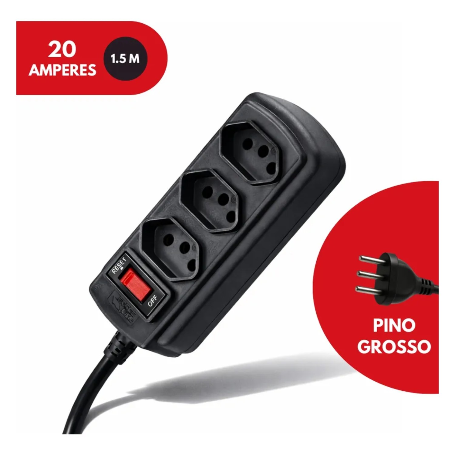 FILTRO DE LINHA 3 TOMADAS 20A 1.5 METROS DISJUNTOR REARMAVEL FORCE LINE PRETO 60300011