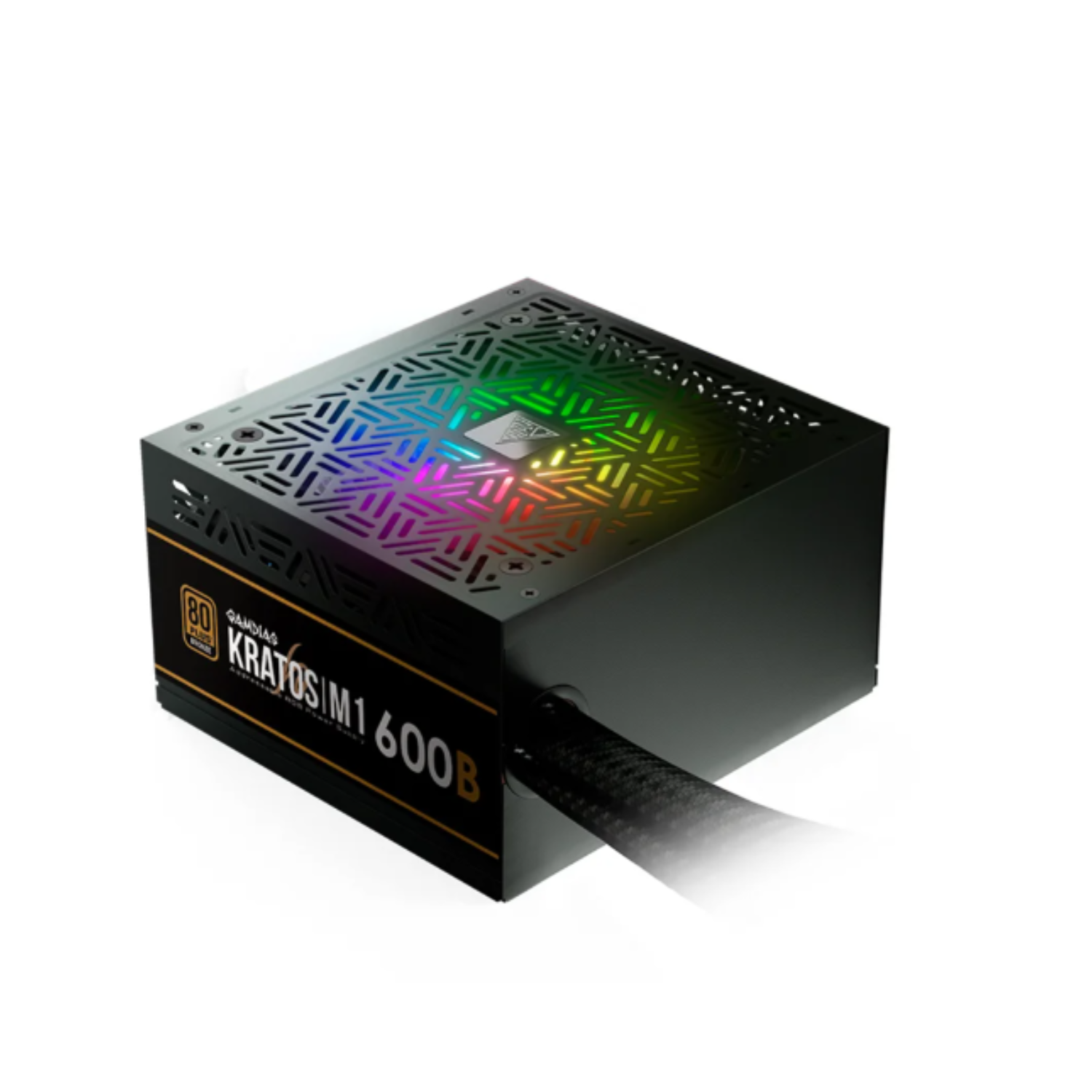A Gamdias Kratos M1 600W 80 PLUS Bronze (M1‑600B) é uma fonte de alimentação padrão ATX voltada para setups gamer ou intermediários. Ela entrega 600 watts de potência contínua com certificação de eficiência Bronze, oferecendo equilíbrio entre desempenho e custo. Seu design conta com iluminação RGB e modo silencioso para ventilação.