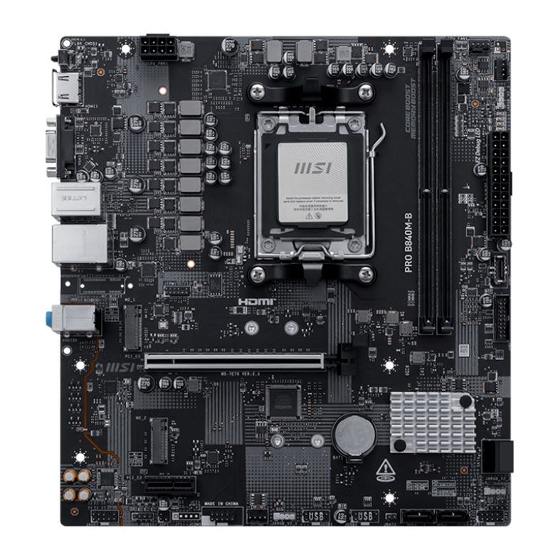 A PRO B840M-B foi projetada com diversos recursos exclusivos da MSI, como PCIe 4.0 M.2, EZ PCIe Clip II, LAN de 2,5G e porta USB-C frontal, sendo compatível com os processadores AMD Ryzen™ série 9000.