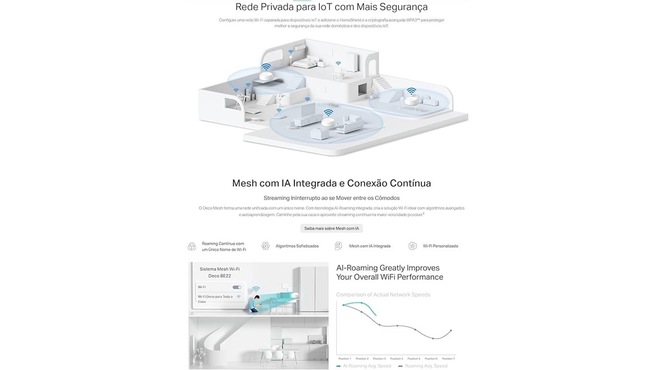 • Cobertura sem costura para toda a casa: o roaming orientado por IA garante que os dispositivos permaneçam conectados ao sinal mais forte em sua casa, criando uma rede de malha verdadeiramente unificada.