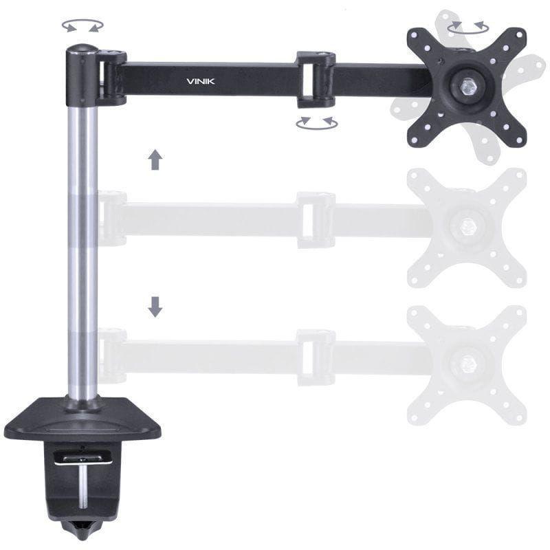 SUPORTE PARA MONITOR 12" A 32" VESA 100X100 - SM330B Descrição: A Vinik possui uma linha completa em suportes para monitores, televisores e projetores, todos produzidos com material de alta qualidade, que garantem durabilidade aos produtos. Este suporte comporta o uso de um monitor. O braço possui movimentação de profundidade, giro vertical e horizontal do monitor. Possui regulagem de altura através do eixo central. Corpo todo constituído em metal, assegurando a qualidade do produto; Base com regulagem de altura, podendo ser instalado em mesas e bancadas mais espessas. Acabamento em preto fosco, ideal para uso nos mais diversos ambientes. Fácil instalação: apenas a base deve ser montada pelo instalador, as demais peças estão montadas de fábrica. Dados técnicos Material: Aço, Alumínio e Plástico Pintura: Eletrostática Compatibilidade: monitores de 12"" a 32" Peso suportado: 20kg Padrão VESA: 50x50 - 75x75 - 100x100mm Altura: 49cm / Comprimento: 8cm Permite regulagem de ângulo Possui rotação de até 270 em seu braço articulado. Peso do produto: 2.4Kg Obs.: Certifique-se de que o padrão VESA do seu monitor é compatível com este suporte. Alguns modelos de monitores podem ultrapassar esta medida. Este padrão trata-se das distâncias entre os furos na parte traseira do monitor, que deve ser no máximo, 100x100mm.