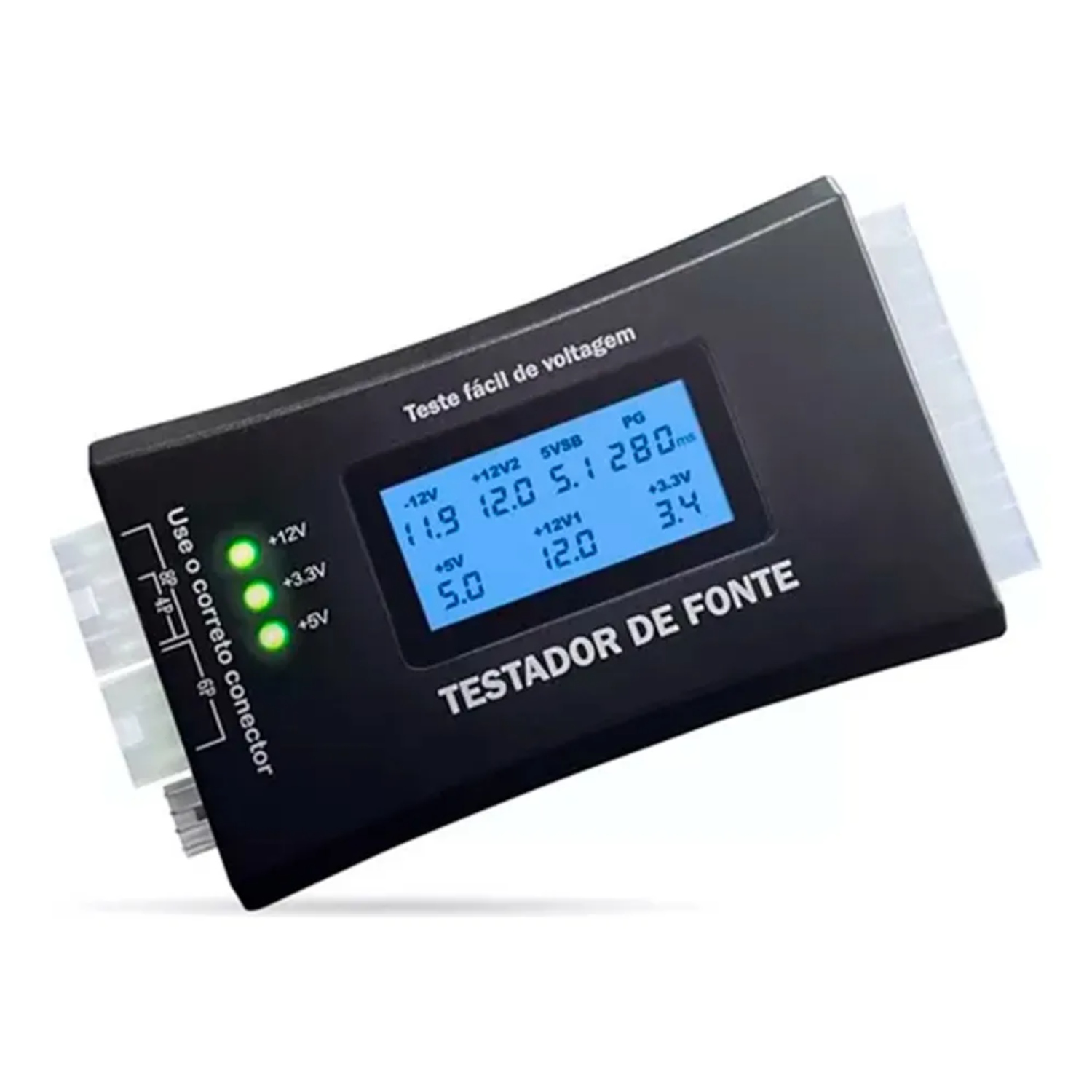 Compatível com conectores ATX de 20 e 24 pinos, SATA, Molex (IDE), CPU 4/8 pinos, PCI-E e FDD, o testador exibe em um display LCD de fácil leitura os valores de tensão em tempo real, ajudando a identificar falhas antes que causem prejuízos.